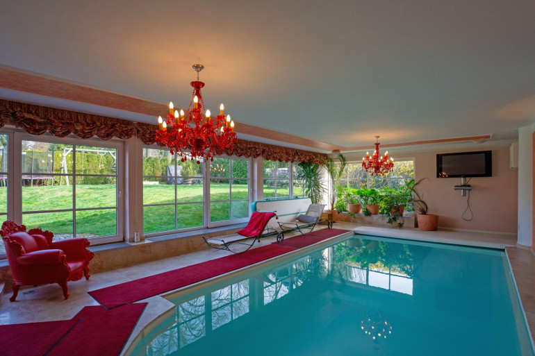 Ein besonderes Highlight ist die Schwimmhalle mit Gegenstromanlage und direktem Gartenbezug. Ergänzt wird das Angebot durch Sauna, Vinothek, großzügige Terrassenflächen und ein charmantes Turmzimmer.