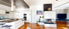 Glaskamin mit Speichersystem im Wohn- und Küchenbereich