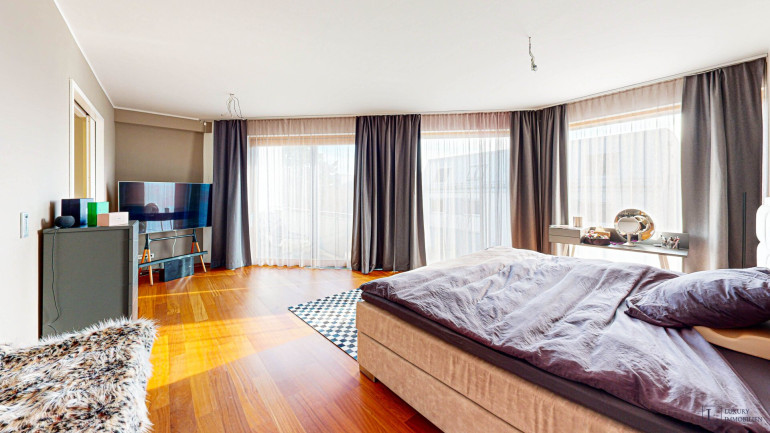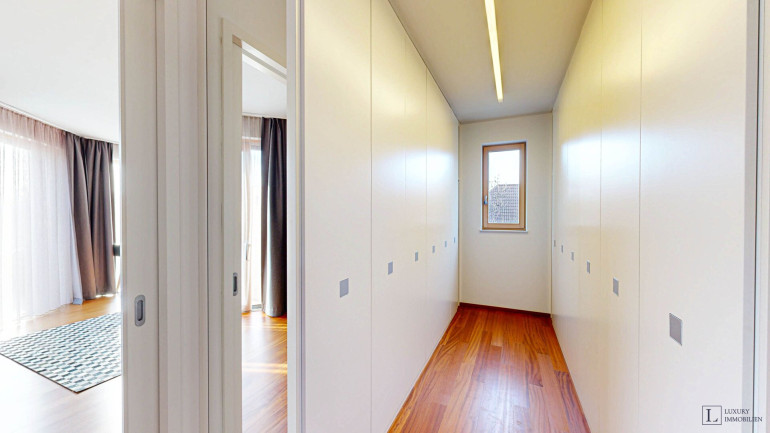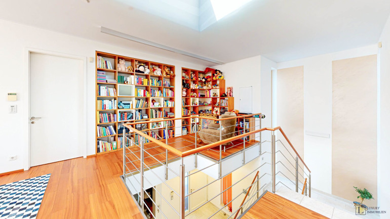 Das Obergeschoss mit Südbalkon ist als privater Rückzugsbereich konzipiert. Der Masterbereich umfasst ein großzügiges Schlafzimmer, eine begehbare Garderobe und ein elegantes Bad en suite. Drei weitere Schlafzimmer, ein zusätzliches Badezimmer sowie eine helle Galerie runden diese Ebene ab.