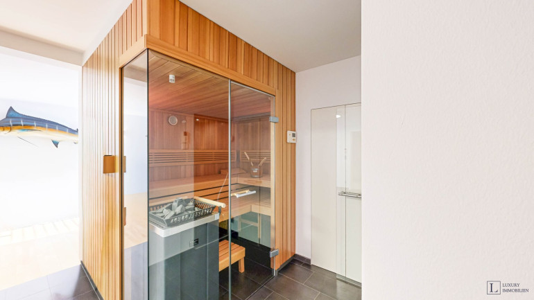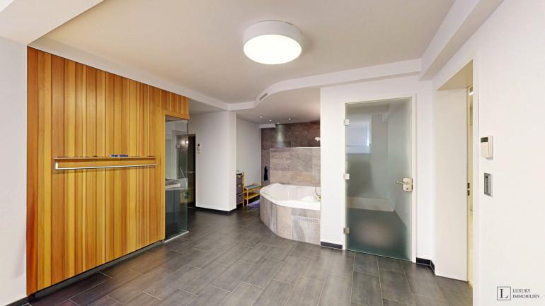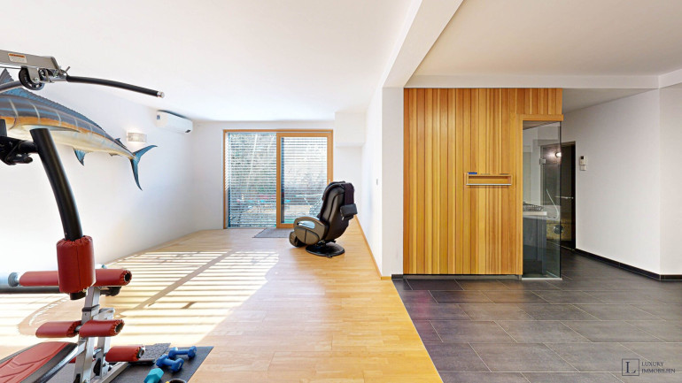 Das Untergeschoss präsentiert sich als exklusive Wellness- und Freizeitlandschaft. Es verfügt über einen hochwertigen Spa-Bereich mit Sauna, Dampfbad und Whirlpool mit Gartenzugang, einen großzügigen Party- und Aufenthaltsraum, Wirtschafts- und Technikräume sowie einen Weinkeller.