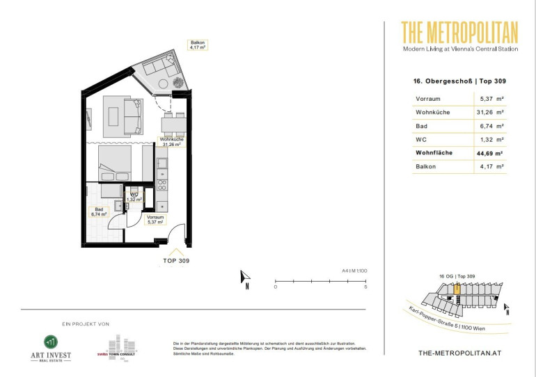 Hippe Cafés, coole Bars und jede Menge Unbeschwertheit: The Metropolitan liegt an der schillernden Vienna Central Station zwischen dem modernen Quartier Belvedere und dem grünen Sonnwendviertel. Hier können Sie abseits des Mainstreams der Stadt abhängen und originelle Shops, Lokale, Kunst- und Kulturangebote sowie Frischluft in grünen Parkanlagen vor der Haustüre genießen. Zahlreiche attraktive Plätze laden zum Verweilen, Bewegen und Staunen ein. In nur wenigen Schritten sind die Bezirke Wieden, Landstraße und das historische City Center erreichbar. Ob Tennis im Arsenal, zeitgenössische Kunst im Belvedere 21 oder ein Cocktail auf der Rooftop-Bar gegenüber – in der Karl-Popper-Straße 5 kann man eins werden mit dem pulsierenden Stadtleben und zwischendurch Ruhe in den benachbarten und üppig grünen Parks finden. Alles ist möglich – an diesem einmaligen Standort.