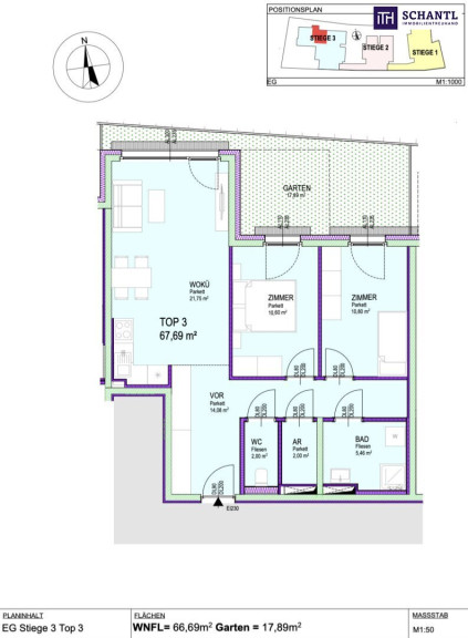 Wohnfläche: ca. 66,69 m² + Garten: ca. 18 m² + Kellerabteil