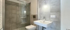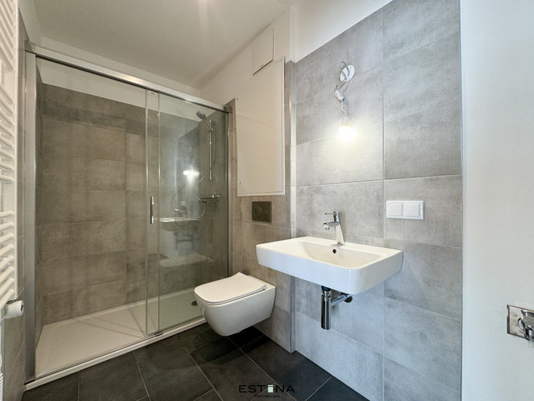 - Badezimmer mit Dusche, Waschbecken, Toilette und Waschmaschinenanschluss