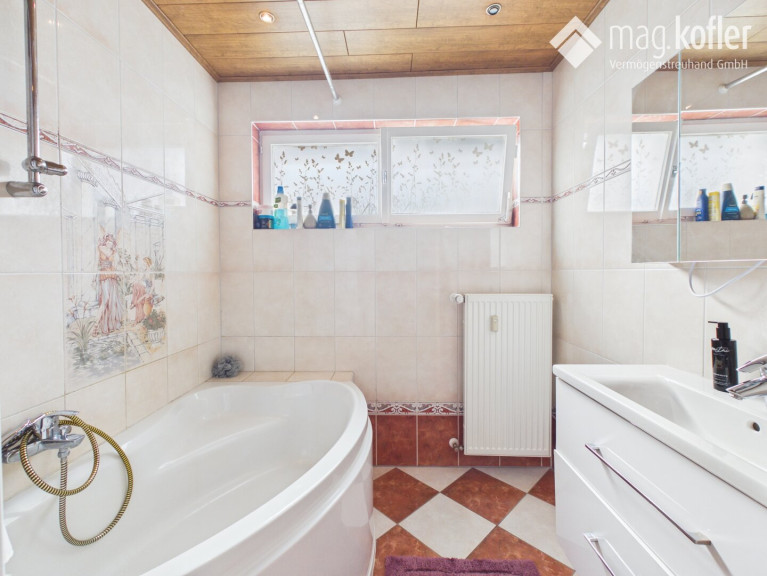 Fliesen, Laminatboden, Zentralheizung, Einbauküche, Bad mit Fenster, Badewanne, Garage, Wasch/Trockenraum