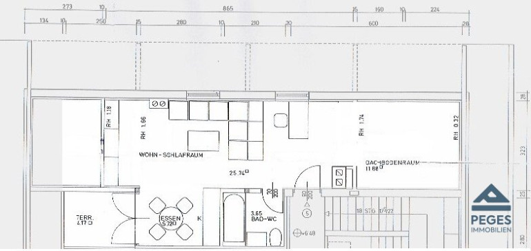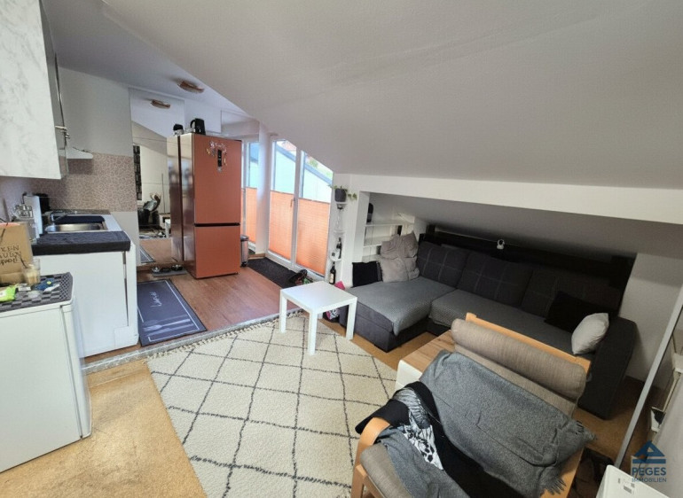 Bei Betreten der Wohnung gelangt man bereits in den gemütlichen Wohnbereich, welcher auf beiden Seiten ein von der Mansarde begrenzt wird. Diese bittet Platz für die Einrichtung des Schlafbereiches bzw. wurde diese an einer Seite mit Regaleinbauten versehen. Eine Küchenzeile (samt Geräten - mit Geschirrspüler, usw.) ist eingerichtet. Die gemütliche Terrasse mit süd-östlicher Ausrichtung ist von hier aus begehbar und lädt zum verweilen ein. Der Sanitärbereich ist mit einer Badewanne und WC ausgestattet. Zudem befindet sich hier ein Waschmaschinenanschluss.