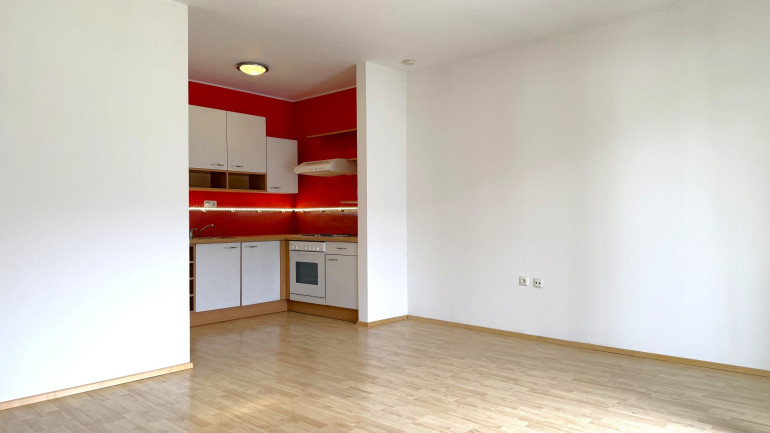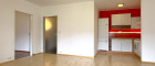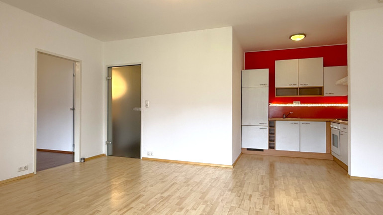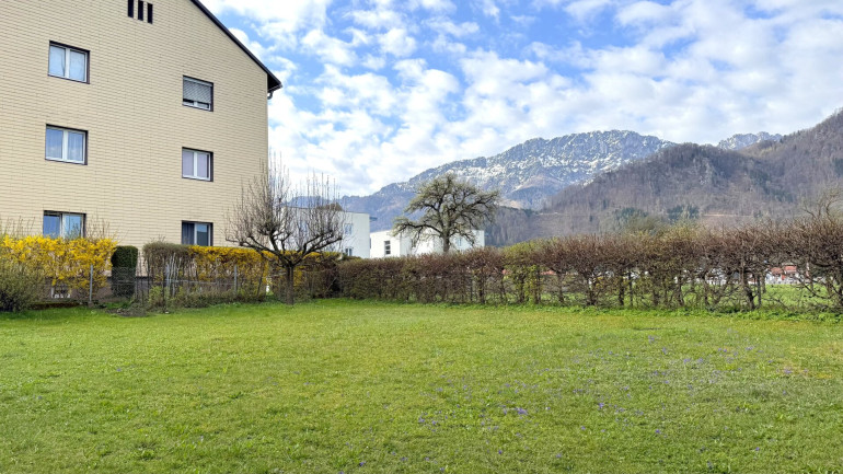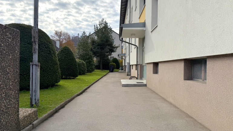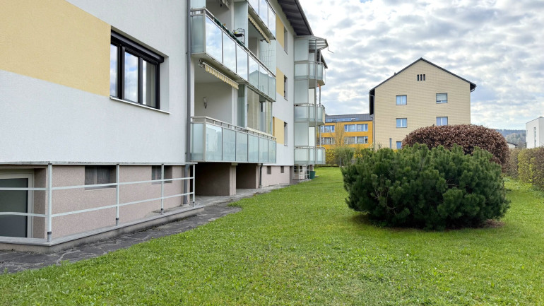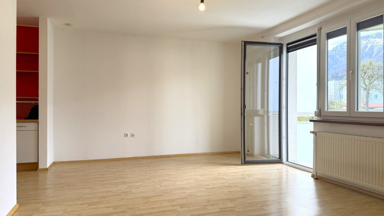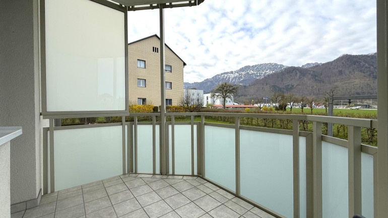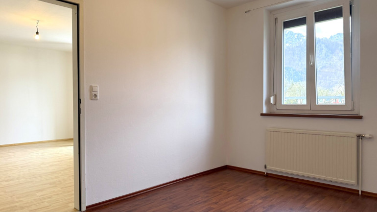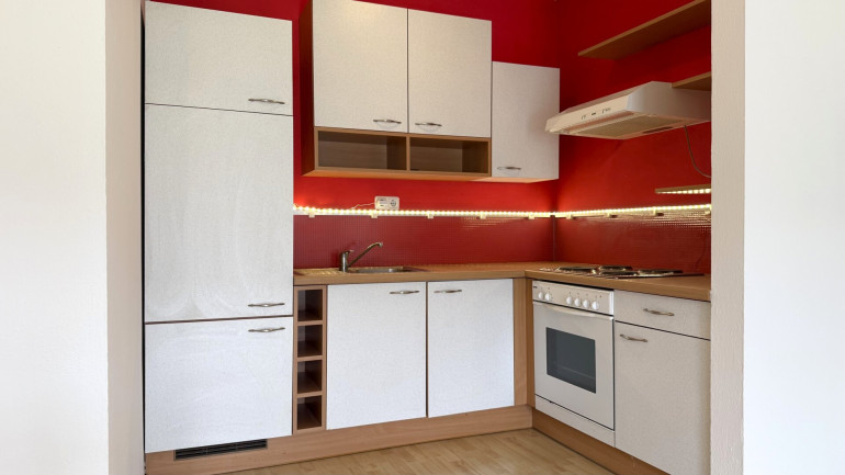 Das Herzstück ist der großzügige Wohnbereich, der über eine Balkontür direkt ins Freie führt. Die Loggia bietet einen offenen Blick auf die umliegenden Wiesen und das Bergpanorama. Die eingerichtete Küchenzeile bleibt in der Wohnung und macht den Einzug unkompliziert.