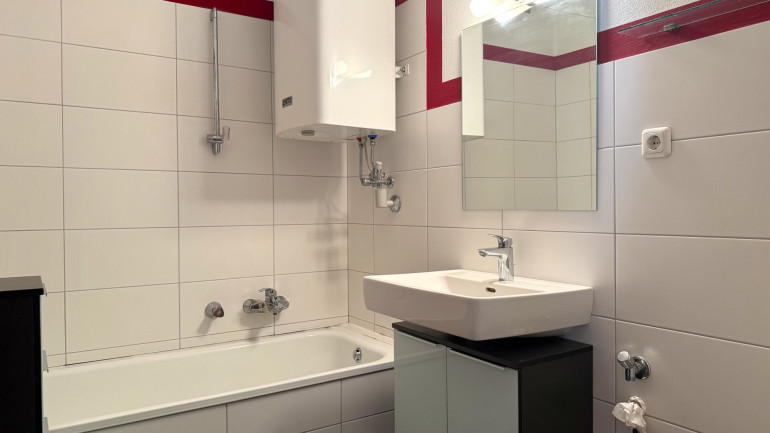 Das separate Schlafzimmer gibt der Wohnung eine klare Struktur, die trotz der kompakten Gesamtfläche Wohnen und Schlafen sauber trennt. Das Bad verfügt über eine Badewanne mit Duschaufsatz sowie einen Wasserboiler zur Warmwasserbereitung. Eine separate Toilette ergänzt den Sanitärbereich.