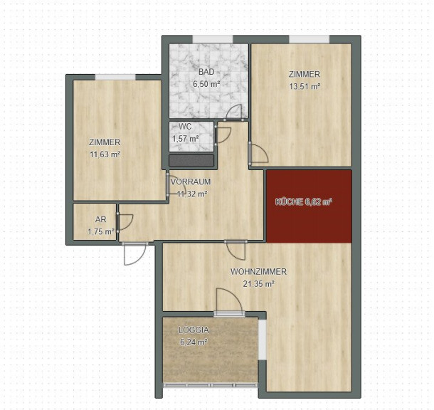 Das Herzstück der Wohnung bildet der offen gestaltete Wohn- und Essbereich mit integrierter Küche. Dieser großzügige Raum bietet viel Platz für individuelle Gestaltung und lädt sowohl zum Entspannen als auch zum geselligen Beisammensein ein.