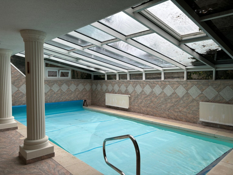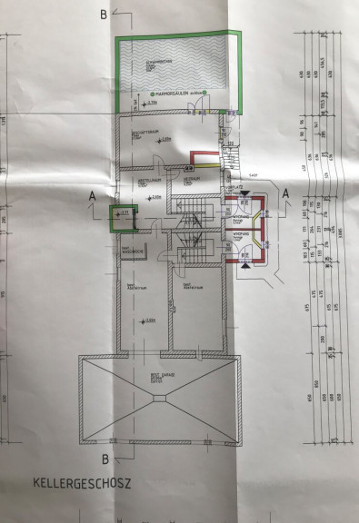 Kellergeschoß cirka 117 m² plus Schwimmhalle 55 m²: Garage 69 m², 3 Abstellräume (Waschküche), Heizraum, ein ehemaliger Geschäftsraum 27 m² mit extra Eingang, 2 WC, Schwimmhalle mit Becken cirka 8 x 4m