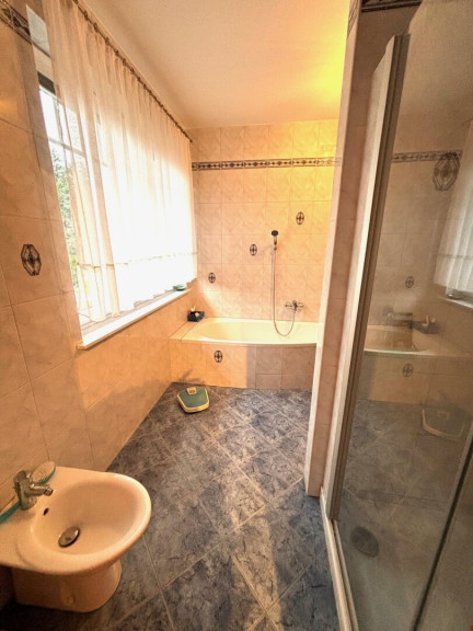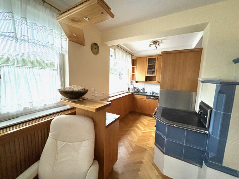 Erd- und Obergeschoß, je Haushälfte cirka 116 m²: Der rechte Hausteil wurde 2005 gesamt modernisiert, ein gemütlicher Kachelofen eingebaut, ein Erker für den Essbereich, Küchen- und Wohnbereich gestaltet, Böden, Bad und 3 WC erneuert, Fußbodenheizung. Der linke Hausteil ist leer, so können die Räume, Bad und 1 WC neu gestaltet werden.