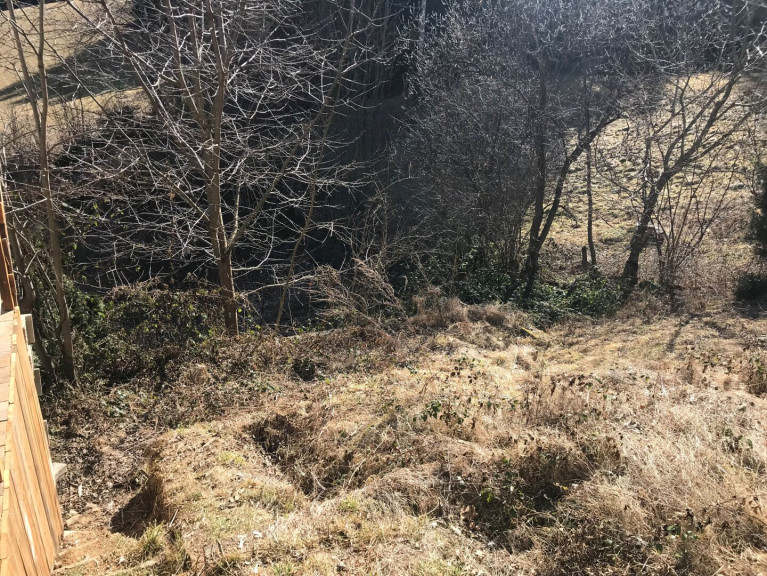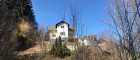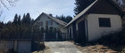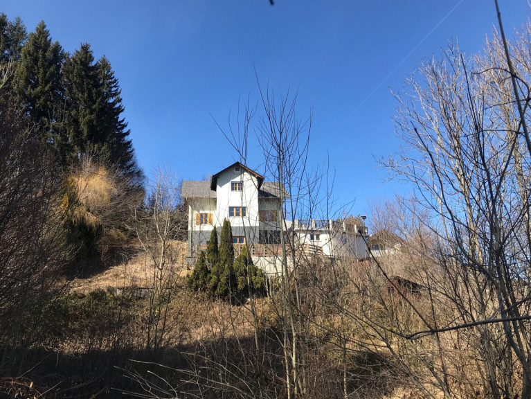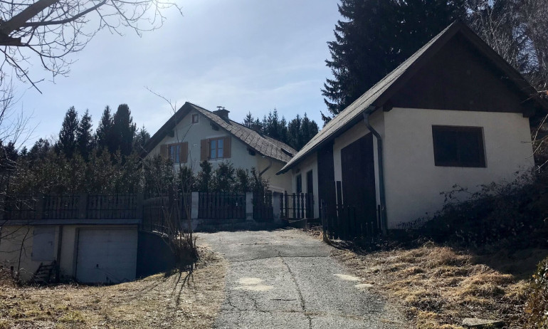 Umgeben von Wiesen und Bäumen liegt das dreigeschoßige Haus. Der Nahbereich des Hauses ist eingeebnet, das restliche Grundstück weist Hanglage auf. Die Zufahrt zur Liegenschaft erfolgt über eine asphaltierte Straße, am Grundstück ist die Zufahrt geschottert. Rechts vom Gartentor befindet sich ein Nebengebäude, daneben ist ausreichend Platz für einen (noch nicht errichteten) Carport für 2 Fahrzeuge. Links vom Gartentor befindet sich ein weiteres Nebengebäude mit Garage. Der Zugang zum Wohnhaus erfolgt über eine großzügige ostseitige Terrasse und von hier geht es weiter über eine Außentreppe hinunter zu einer südwestseitigen ebenfalls großen Holz-Terrasse und zum Keller.