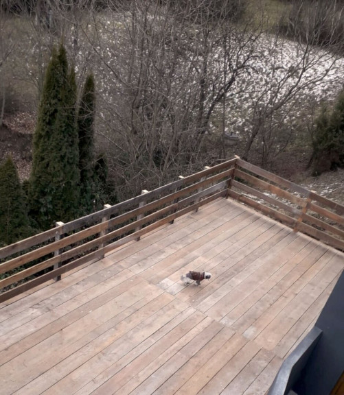 Die ostseitige Terrasse vor dem Hauseingang ist rund 40 m², von hier geht die Außentreppe hinunter zur zweiten südwestseitigen Terrasse mit cirka 50 m²