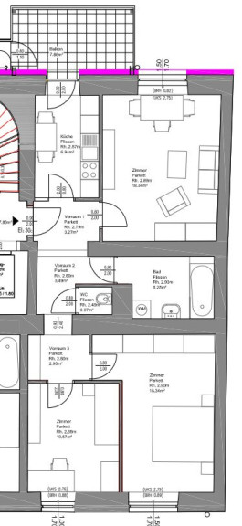 Vorzimmer, 3 Zimmer, Küche, ca. 8 m2 Balkon, Badezimmer, separates WC + Kellerabteil