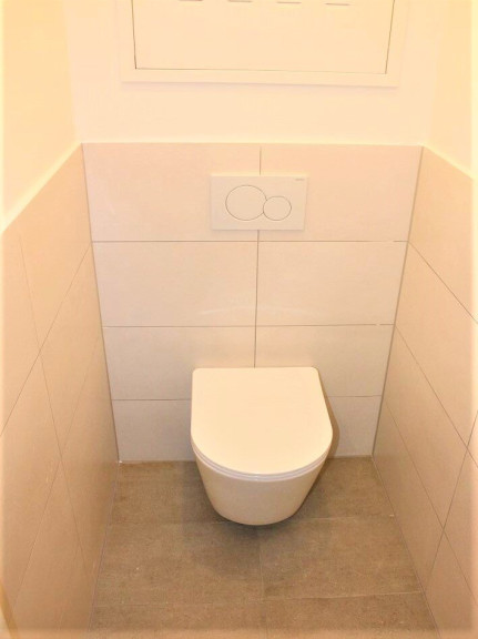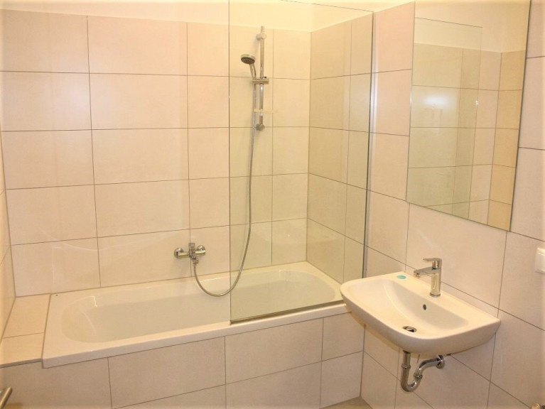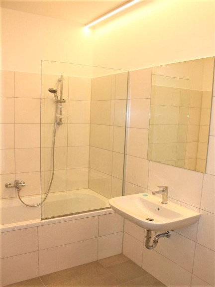 + Badezimmer mit Badewanne, Waschtisch und Waschmaschinenanschluss