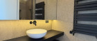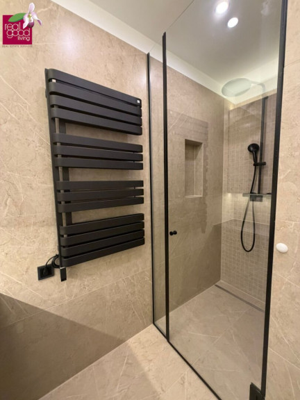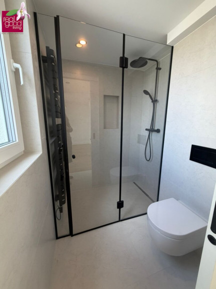 - Großformatige Fliesen (60x120) + Mosaikdetails