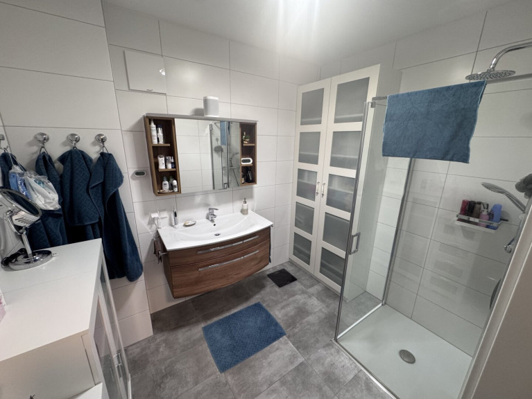 Der Grundriss ist optimal gestaltet und überzeugt durch helle, freundliche Räume, die mit hochwertigen Parkett- und Fliesenböden ausgestattet sind. Die Fußbodenheizung sorgt für wohlige Wärme und angenehmes Raumklima an kalten Tagen, ergänzt durch eine effiziente Zentralheizung.