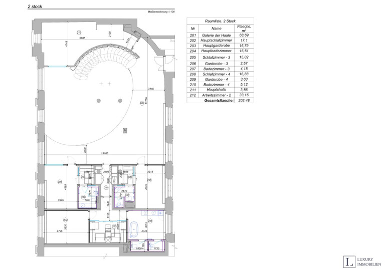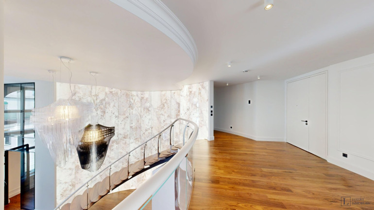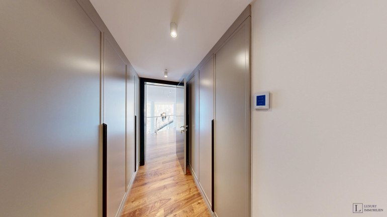 Über eine Galerie gelangt man in das Obergeschoss, das durch einen exklusive Schlafsuite beeindruckt: ein Schlafzimmer mit großzügiger Ankleide und luxuriösem Badezimmer bietet höchsten Wohnkomfort. Zwei weitere Schlafzimmer – jeweils mit eigenem Bad und Ankleideraum – ein zusätzliches Arbeitszimmer (ca. 33 m²) sowie eine repräsentative Hallen-Galerie (ca. 68 m²) runden diese Ebene perfekt ab.