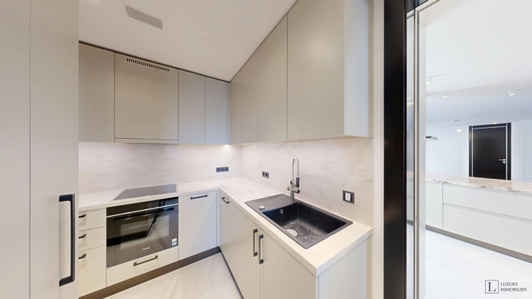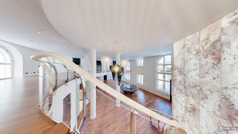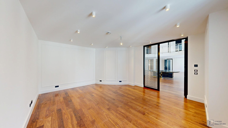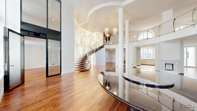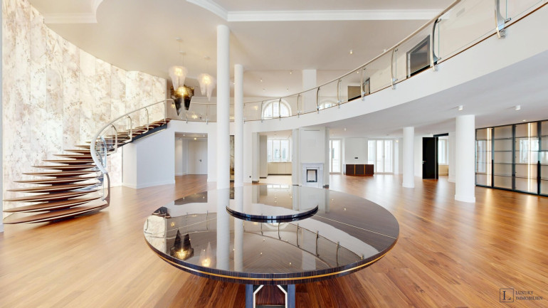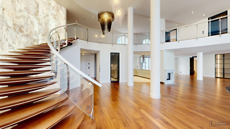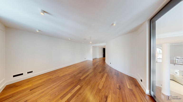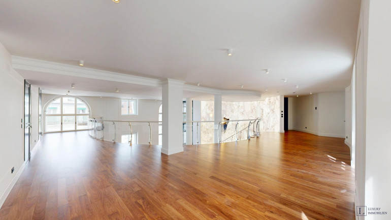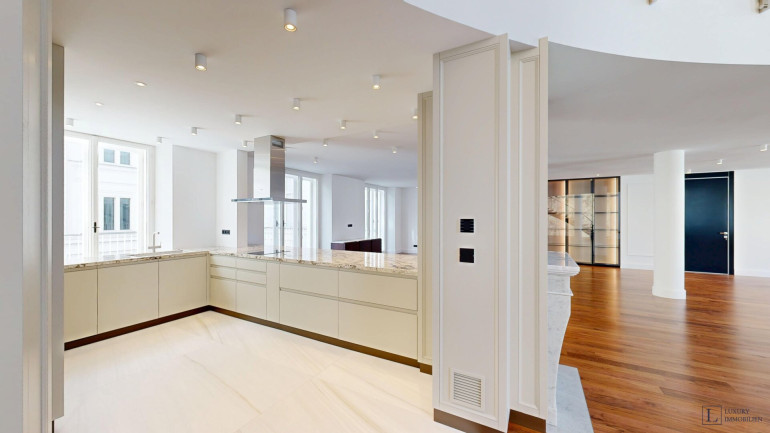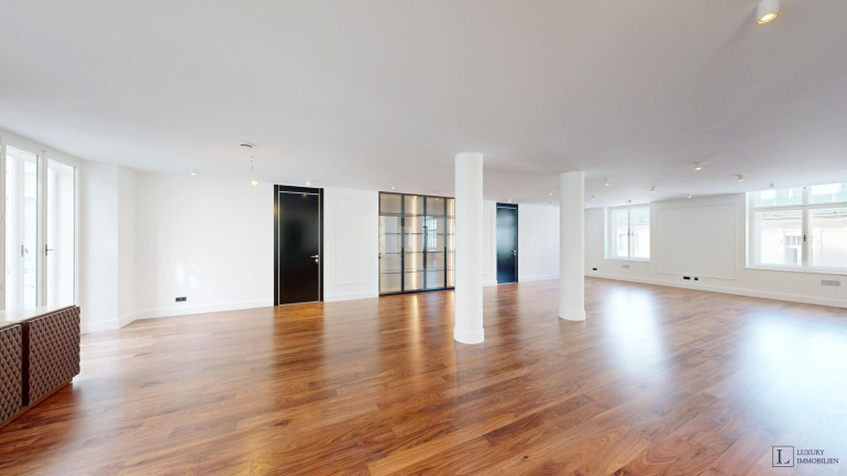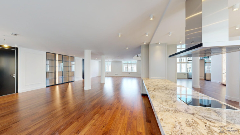 Mit einer großzügigen Wohnfläche von ca. 497 m² bietet das Loft vielfältige Gestaltungsmöglichkeiten. Im Erdgeschoss befinden sich ein imposanter Wohnbereich (ca. 84 m²) und ein weitläufiges Esszimmer (ca. 88 m²), die zusammen das Herzstück der Wohnung bilden. Raumhohe Fenster durchfluten die Räume mit Tageslicht und schaffen eine elegante Atmosphäre – ideal für gesellige Abende, stilvolle Empfänge oder entspannte Stunden im Kreis der Familie. Direkt angrenzend liegen die Hauptküche sowie eine separate technische Küche.