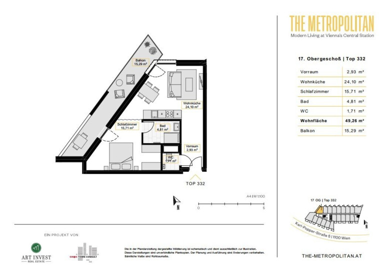 Hippe Cafés, coole Bars und jede Menge Unbeschwertheit: The Metropolitan liegt an der schillernden Vienna Central Station zwischen dem modernen Quartier Belvedere und dem grünen Sonnwendviertel. Hier können Sie abseits des Mainstreams der Stadt abhängen und originelle Shops, Lokale, Kunst- und Kulturangebote sowie Frischluft in grünen Parkanlagen vor der Haustüre genießen. Zahlreiche attraktive Plätze laden zum Verweilen, Bewegen und Staunen ein. In nur wenigen Schritten sind die Bezirke Wieden, Landstraße und das historische City Center erreichbar. Ob Tennis im Arsenal, zeitgenössische Kunst im Belvedere 21 oder ein Cocktail auf der Rooftop-Bar gegenüber – in der Karl-Popper-Straße 5 kann man eins werden mit dem pulsierenden Stadtleben und zwischendurch Ruhe in den benachbarten und üppig grünen Parks finden. Alles ist möglich – an diesem einmaligen Standort.