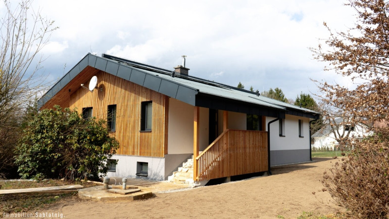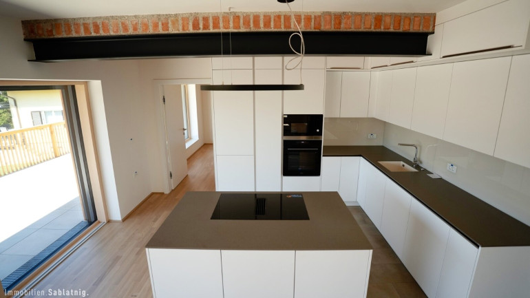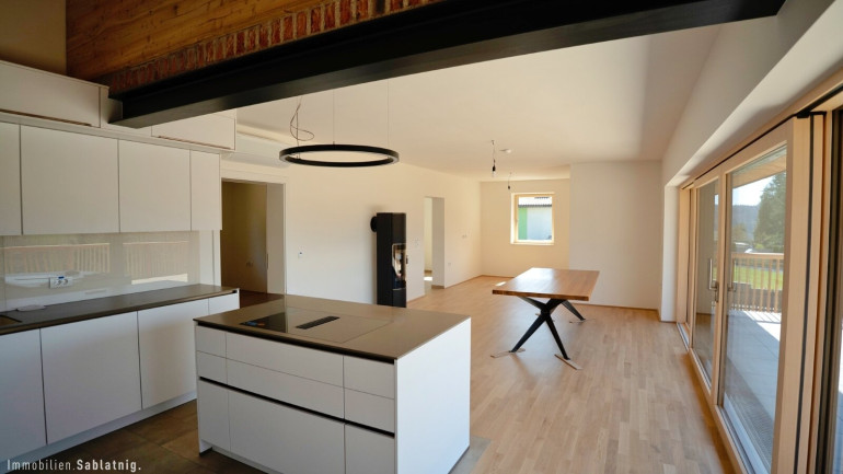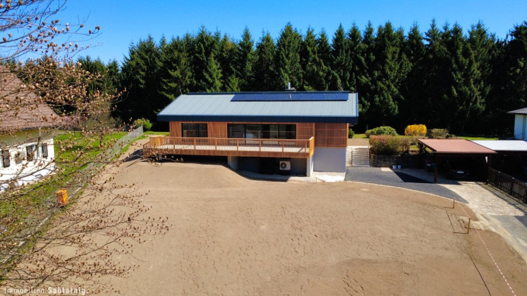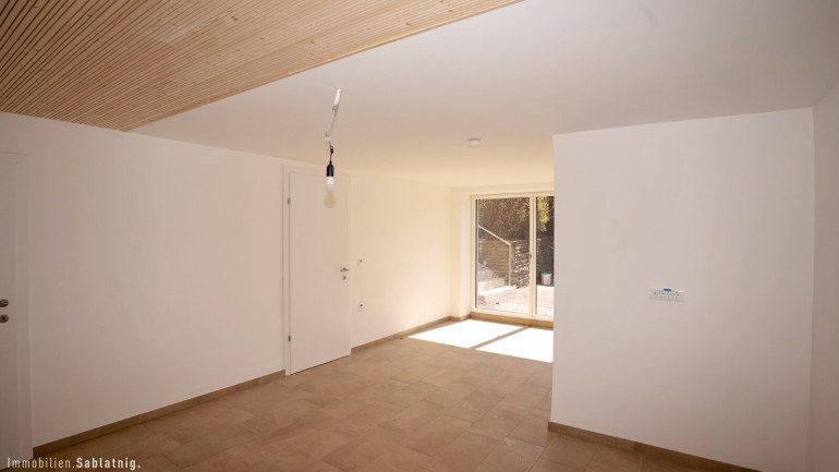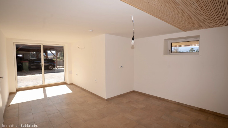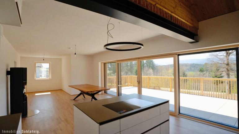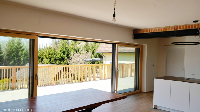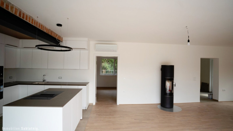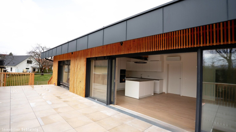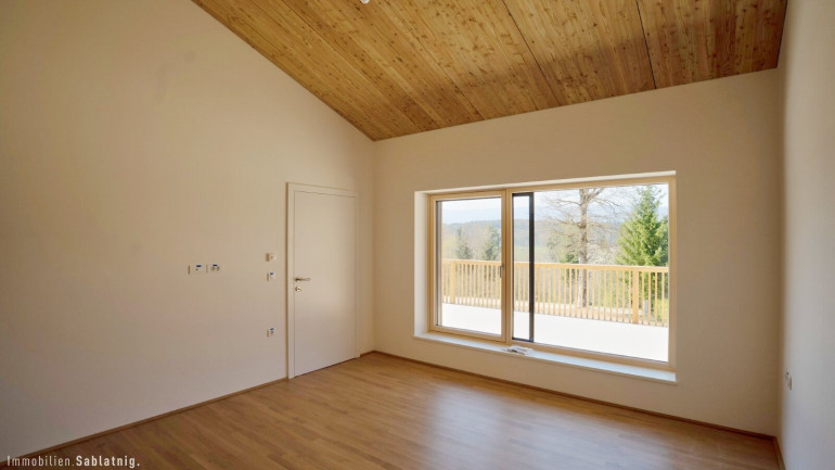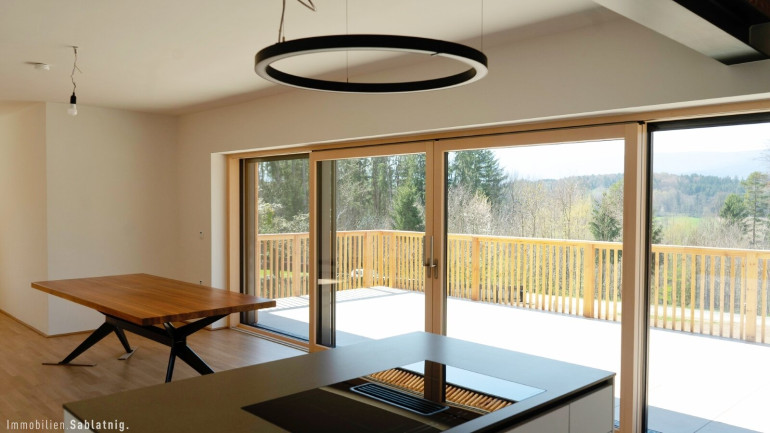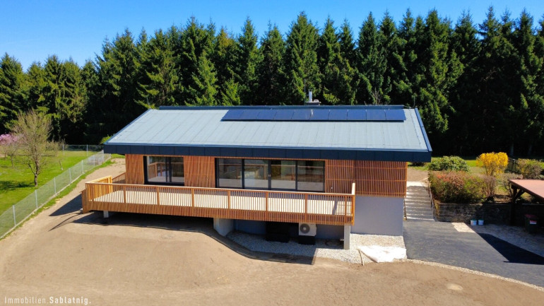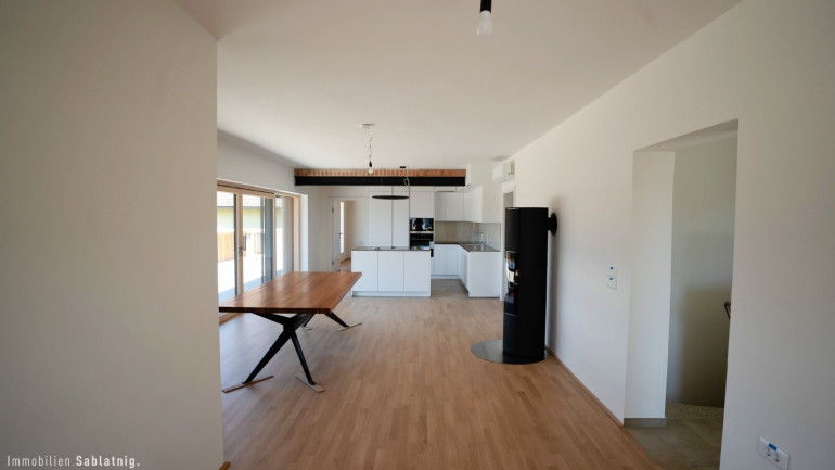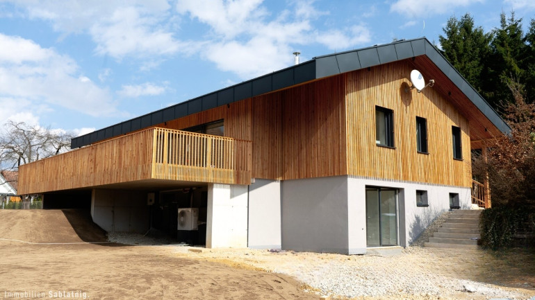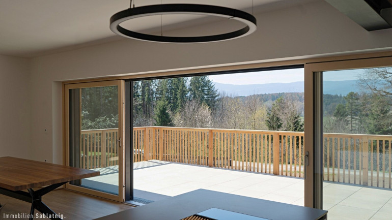 Ein echtes Highlight ist die großzügige, sonnenverwöhnte Terrasse, die zum Verweilen und Genießen einlädt – hier eröffnet sich Ihnen ein unvergleichlicher Ausblick in das weststeirische Hügelland, begleitet von stimmungsvollen Sonnenuntergängen. Die elegante Holzverkleidung verleiht dem Haus eine warme, stilvolle Ausstrahlung und schafft eine echte Wohlfühloase.