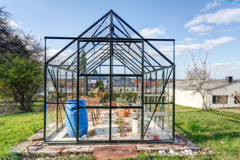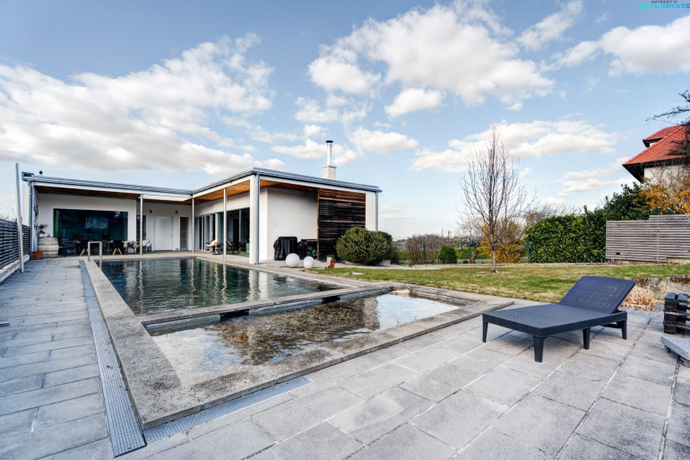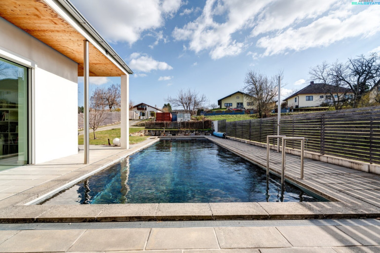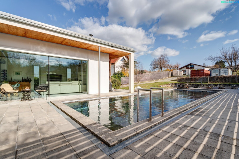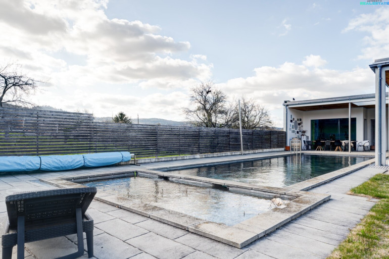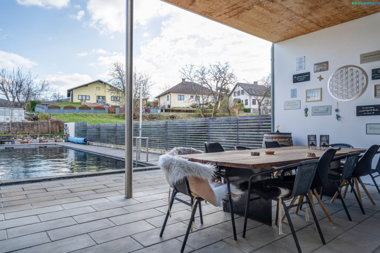 Ein besonderes Highlight stellt der idyllische Außenbereich dar: Der Naturpool fügt sich harmonisch in den Garten ein und schafft eine exklusive Wohlfühloase. Ergänzt wird das Angebot durch eine praktische Gartenhütte sowie eine Doppelgarage, die ausreichend Platz für Fahrzeuge und zusätzlichen Stauraum bietet.