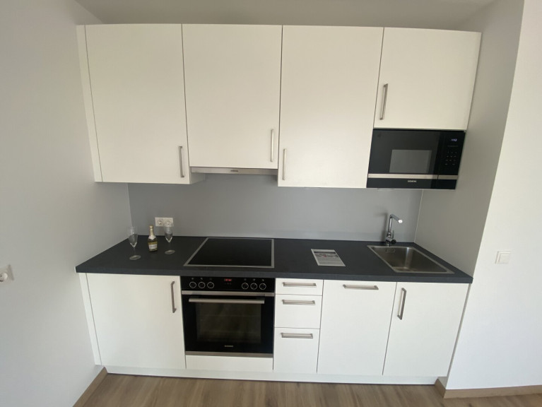 Fliesen, Laminatboden, Fußbodenheizung, Einbauküche, Wohnküche / offene Küche, Personenaufzug, Dusche
