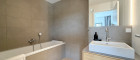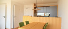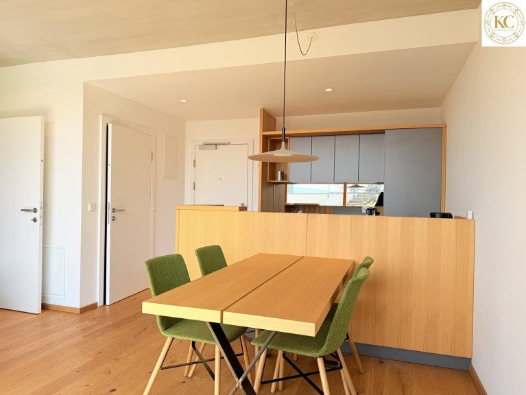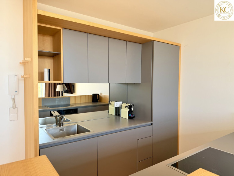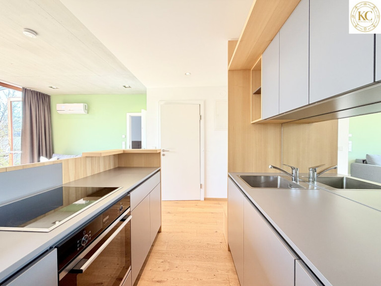 Das Apartment überzeugt durch eine geschmackvolle, maßgefertigte Einrichtung, teilweise in edlem Massivholz ausgeführt. Die voll ausgestattete Küche lässt keine Wünsche offen und eröffnet beim Kochen einen herrlichen Blick ins Freie. Der Wohnbereich ist großzügig gestaltet, das Sofa lässt sich bequem in ein Schlafsofa verwandeln. Auch der Essbereich bietet ausreichend Platz für gesellige Stunden. Das Schlafzimmer ist vollständig eingerichtet, das Badezimmer verfügt über eine Badewanne.