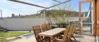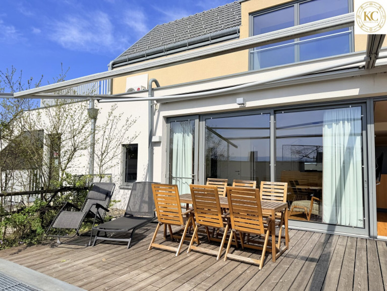Direkt vom Wohnbereich aus gelangen Sie auf die wunderschöne Terrasse – ein Ort zum Entspannen und Genießen. Ob gemeinsames Essen am großen Tisch oder Sonnenbaden auf den Liegestühlen: Hier erleben Sie pure Lebensfreude.