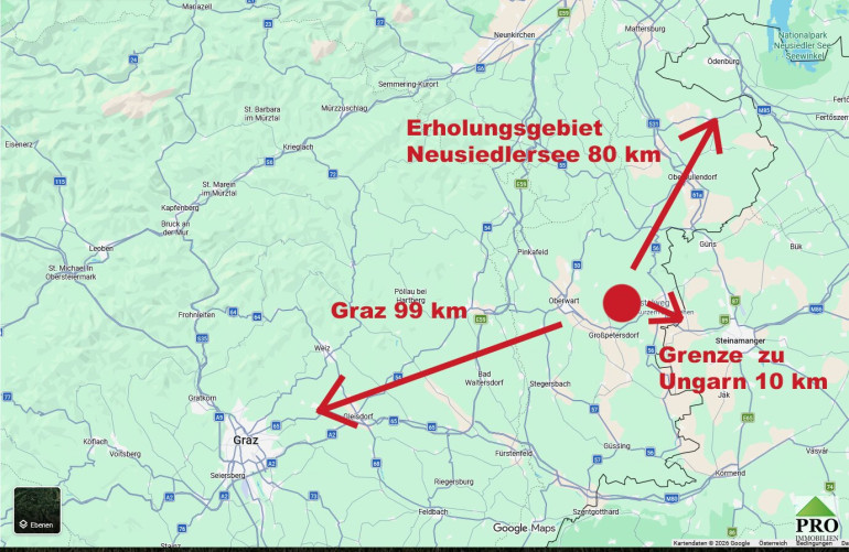 Infrastruktur sind in der nächsten Ortschaft (Großpetersdorf) in ca. 4 Autominuten