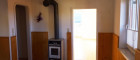 Von der Eingangstüre gelangt man über einen Vorraum zum Wohn-Essbereich, aber auch zum Bad/WC und dem Abstellraum. Neben dem Essbereich ist rechts die Küche (mit Fenster) angegliedert und links ein Schlafzimmer mit Balkon. Im großen Wohnbereich steht ein Kaminofen mit Glasfenster, mit dem dieser Bereich ordentlich geheizt werden kann. Ofenholz kann in dem eigenen, großen Kellerabteil gelagert werden. Zur Ergänzung der Heizung gibt es noch einen elektrischen Radiator im Wohnraum und einen im Bad. Das Warmwasser wird mit einem Elektro-Boiler erwärmt.