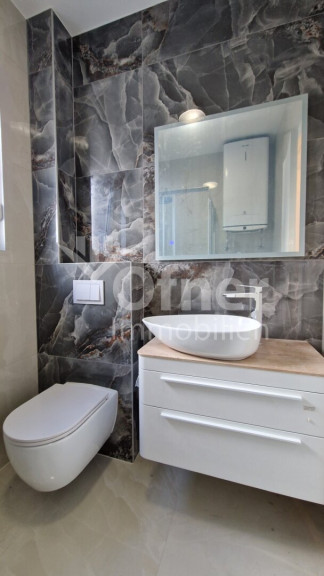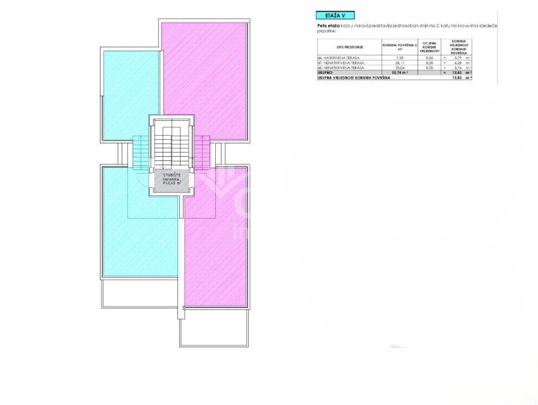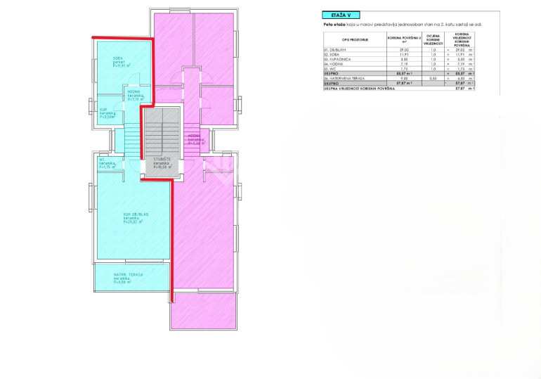 Die Nettofläche des Innenbereichs beträgt 57,87 m², während die gesamte Nettofläche mit allen Zuschlägen 76,45 m² beträgt. Die Raumaufteilung umfasst einen Flur mit sieben Stufen (Split-Level), ein Wohnzimmer mit Küche und Essbereich, ein Schlafzimmer, ein Badezimmer, ein separates WC und eine überdachte Terrasse. Zu den Zuschlägen gehören ein Außenstellplatz mit 2,75 m² sowie eine private Dachterrasse mit einem überdachten Bereich von 3,79 m² und zwei offenen Flächen mit 6,28 m² und 5,76 m², verbunden durch eine interne Treppe.