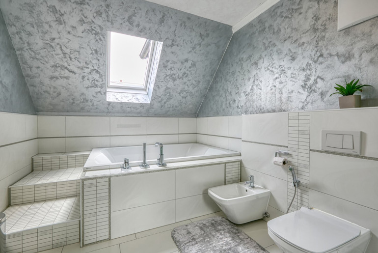 - Badezimmer mit Doppelwaschbecken, Badewanne, WC & Bidet