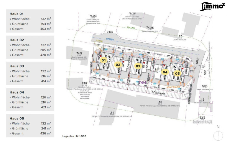 - Einheiten: 4 Doppelhaushälften + 1 Einzelhaus (zentral gelegen)