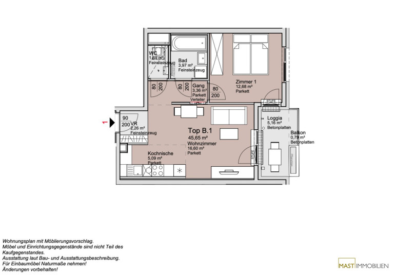 Die Wohnung befindet sich im 1. Liftstock und verfügt über 45,65 m² Wohnfläche + eine 5,95 m² große Freifläche.