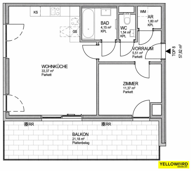 - Zimmer: 2 (WZ 33,37m2 - SZ 11,37m2)