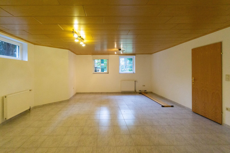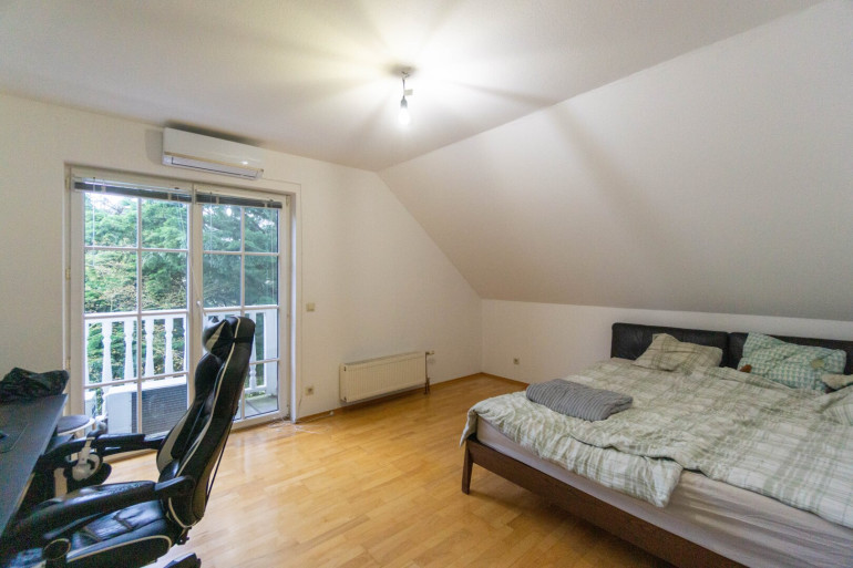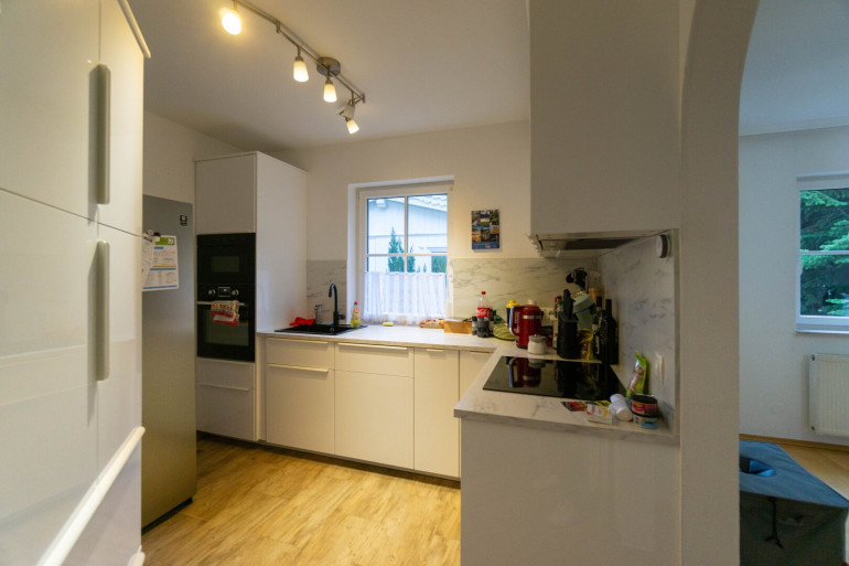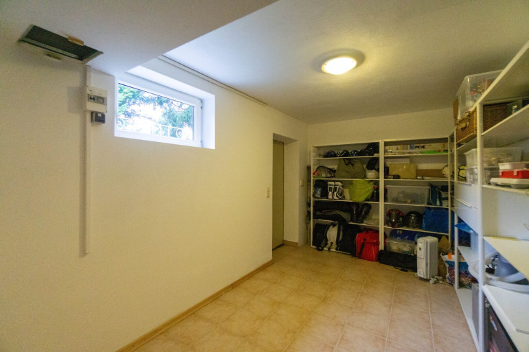 Das 1998 in Fertigbauweise errichtete Haus bietet großzügige, lichtdurchflutete Wohnräume. Im Erdgeschoß sind alle Räume zentral über die Diele erreichbar, darunter ein Abstellraum, ein separates WC sowie ein flexibel nutzbares Zimmer. Der offen gestaltete Wohnbereich (ca. 36 m²) mit großen Fensterflächen und direktem Terrassenzugang geht in den Essbereich und die modern ausgestattete Küche über. Das Dachgeschoß umfasst eine offene Galerie, ein geräumiges Badezimmer mit Badewanne, Dusche und Waschmaschinenanschluss, ein separates WC, ein Zimmer mit Balkon, zwei weitere Zimmer sowie einen Schrankraum. Der beheizte Keller erweitert die Nutzfläche um mehrere Räume, darunter ein Bereich mit Dusche und Sauna, Technikräume sowie ein großer Kellerraum mit über 30 m² und ein Kellerraum mit Gartenausgang.