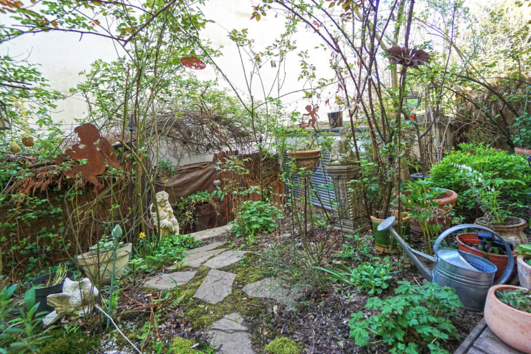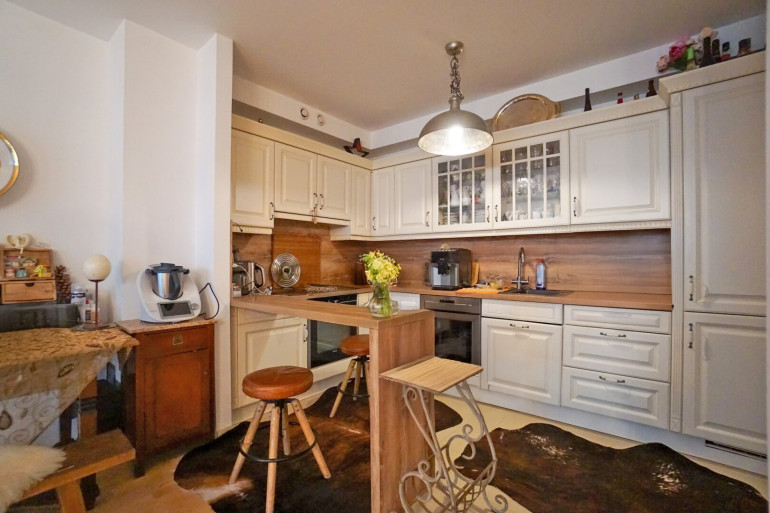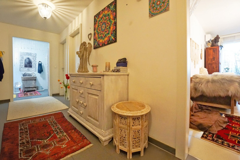 Im Erdgeschoß gelegen unterteilt sich die über 91 m² große Wohnung in einen zentralen Vorraum, Abstellraum, zwei Zimmer, ein Badezimmer mit Wanne, Dusche und Waschmaschinenanschluss und ein separates WC mit Handwaschbecken. Besonders attraktiv ist das lichtdurchflutete Wohn- Esszimmer mit Ausgang auf die Südterrasse und in den liebevoll angelegten Naturgarten. Die offene Wohnküche im Landhausstil ist mit Marken-Geräten ausgestattet. Von beiden südlich ausgerichteten Zimmern gibt es ebenfalls einen Ausgang auf die Gartenterrasse.