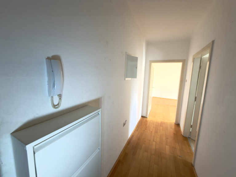 Die Wohnung besticht durch einen durchdachten Grundriss mit einem großzügigen Wohnraum, der durch den Parkettboden eine warme und einladende Atmosphäre schafft. Die möblierte Küche mit Platz für einen Essbereich ist in einem separaten Raum zugänglich.