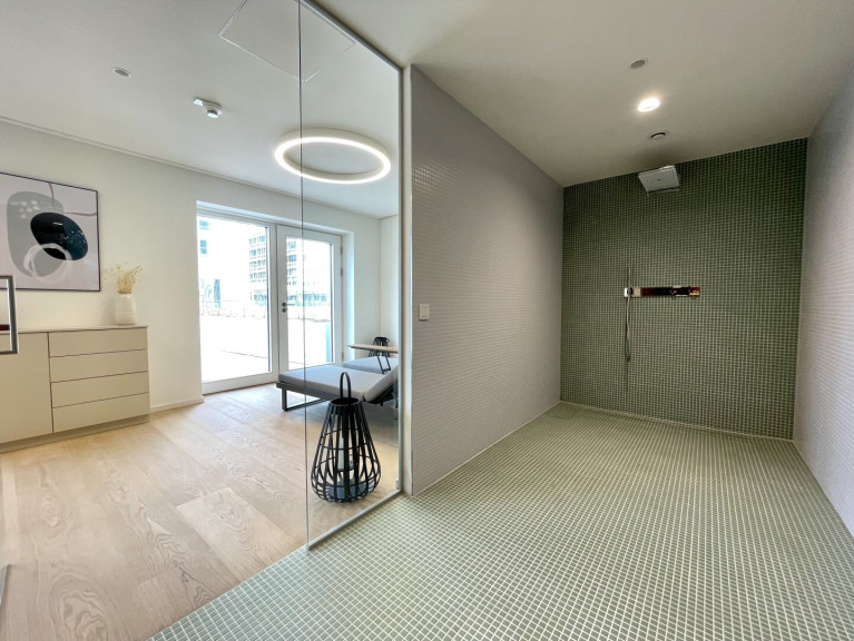 Parkett, Fliesen, Erdwärme, Fußbodenheizung, Wohnküche / offene Küche, Personenaufzug, Badewanne, Dusche, Sauna, Swimmingpool, Wasch/Trockenraum