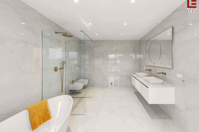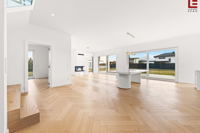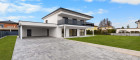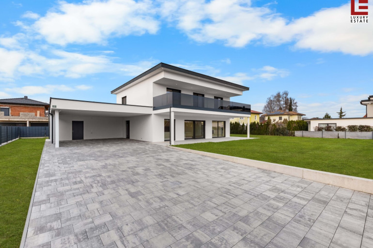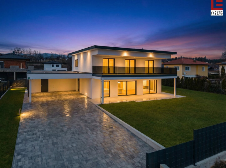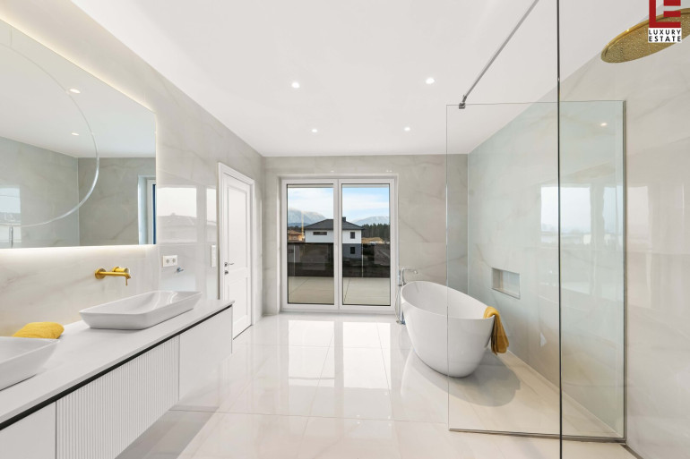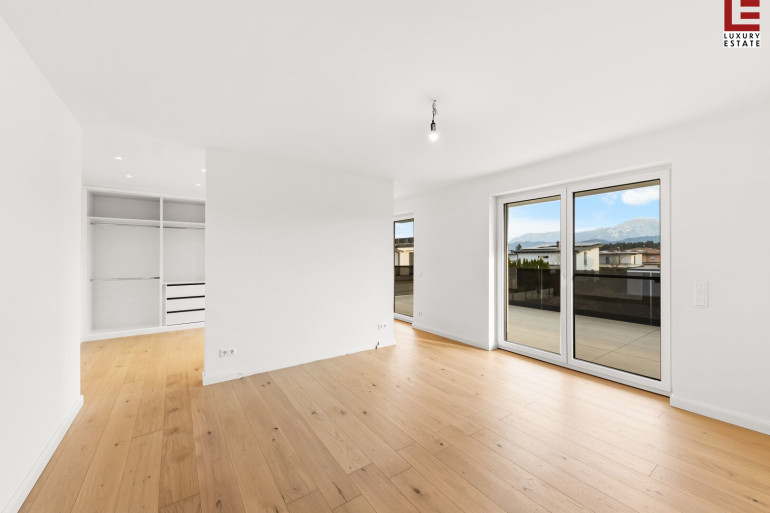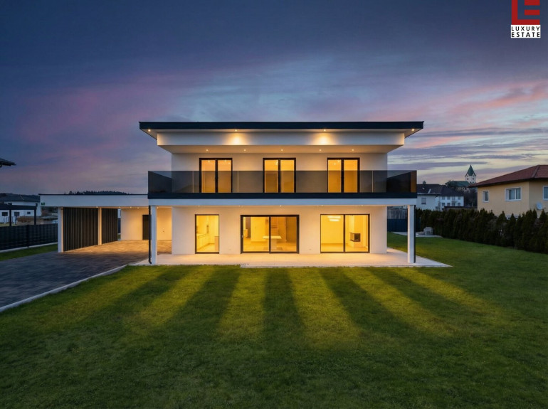 Das 2022 luxuriös und modern gestaltete Einfamilienhaus mit einer Gesamtfläche von 353 m² (davon reine Wohnfläche 262 m²) befindet sich in schöner, sonniger Lage und vermittelt durch seine reduzierte Architektur und sein gut durchdachtes Raumkonzept sofort ein harmonisches Wohngefühl. Eine breite, edel gepflasterte Einfahrt führt Sie zum Eingangsbereich mit einem großen, hohen Doppelcarport und einer massive Eingangstüre. Vorbei an der Garderobe, dem Bad/Gäste-WC gelangen Sie in einen weitläufigen Küchen-, Wohn-, Essbereich. Großzügige Panoramafenster bieten einen wunderbaren Blick auf die nach Süden gerichtete große Terrasse, den Garten und die dahinterliegenden Bergmassive. Die maßangefertigte, offene Küche verfügt über eine Koch- & Arbeitsinsel mit integriertem Abzug. Im Zentrum des Raumes steht ein großer, speziell konzipierter Esstisch, daneben befindet sich der großzügige Wohnbereich mit offenem Kamin. Außerdem gibt es noch ein vielseitig nutzbares 17 m² großes Zimmer im Parterre. Über eine modern verglaste, raffiniert beleuchtete Treppe gelangt man in das Obergeschoß. Hier befinden sich 3 Schlafzimmer, davon ein Master-Bedroom mit eigenem, großen Bad & begehbarer Ankleide. Vor diesem Zimmer aus kommen Sie auf einen 36 m² großen Balkon. Neben dem Vorraum gibt es noch zwei weitere Zimmer, sowie ein großes Bad/WC. Die vorhandene Einrichtung ist maßgefertigt, die Sanitärausstattung ist ausschließlich hochwertige Markenware. Die Fußboden-Heizung erfolgt kostengünstig über eine hochwertige Luftwärmepumpe. Die gesamte Liegenschaft verfügt über eine Smart-Home-Ausstattung und ist somit bequem steuerbar.