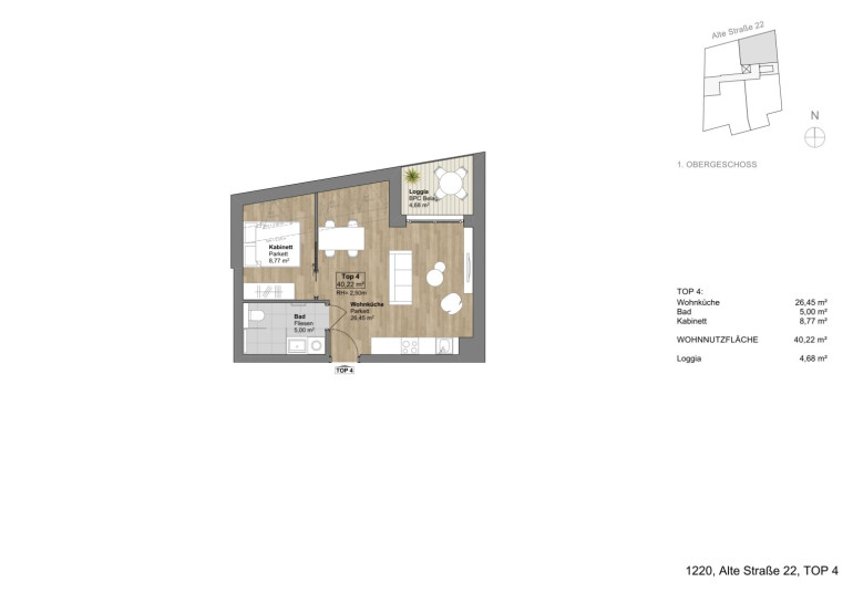 Die hier angebotene Wohnung befindet sich im 1. Obergeschoss und verfügt über eine Wohnnutzfläche von ca. 40,22 m² sowie eine zusätzliche Loggia mit ca. 4,68 m².