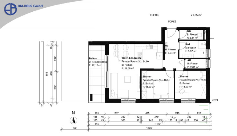 Die TOP 3 im 1. OG besteht aus einem Vorraum, einen Wohn- Esszimmer mit Küche, zwei Schlafzimmern, Bad, WC und einem Abstellraum. Zur Immobilie gehören weiters ein Grünflächenanteil im Eigentum von ca. 92 m², ein Balkon mit 12 m², ein Kellerabteil und ein TG-Platz.