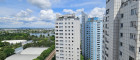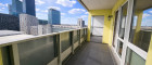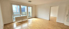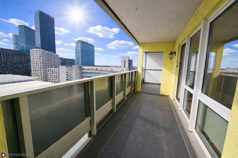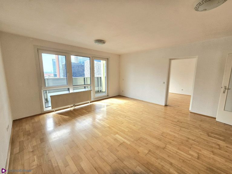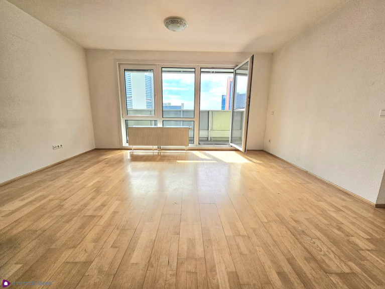 Wohnküche mit kleiner Einbauküche (baulich abgetrennt, Küchennische), mit Ausgang auf die Loggia, Ausrichtung Südost/ Blick zur UNO City