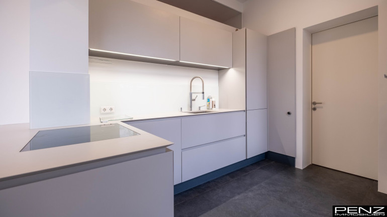 Die moderne Küche ist nicht nur funktional, sondern auch ein Highlight für alle Hobbyköche. Sie bietet ausreichend Stauraum und ist ideal für gesellige Kochabende mit Freunden und Familie. Vom Südbalkon aus genießen Sie einmal den Stadtblick und einmal in den zugehörigen Park ins Grüne – der perfekte Ort, um den Tag mit einem Frühstück in der Sonne zu beginnen oder den Abend mit einem Glas Wein ausklingen zu lassen.