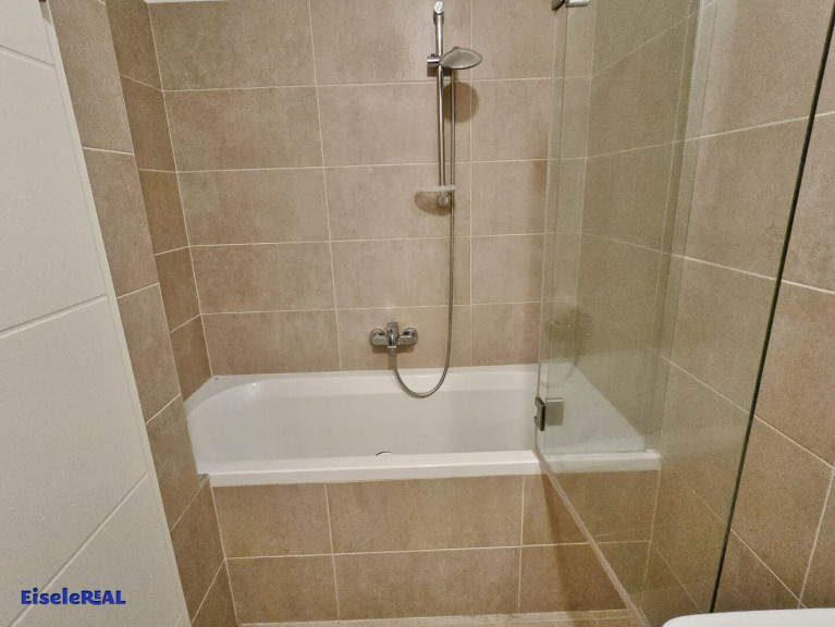 Das Bad ist mit Wanne, Waschbecken und Waschmaschinenanschluss ausgestattet, das WC ist extra.