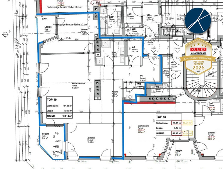 - Top 49 (1.DG): 3 Zimmer / 97,48 m² Wohnfläche + 4,08 m² Loggia 1 + 6,58 m² Loggia 2 Gesamtmiete € 2099,-