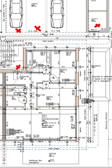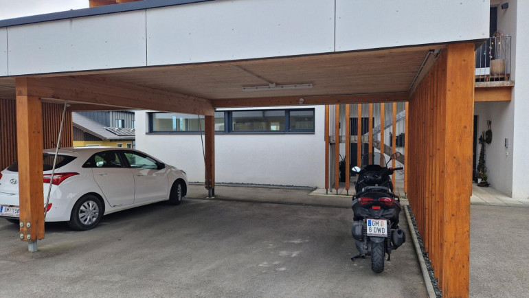 Vor dem Wohnungseingang befinden sich die beiden zugehörigen Carportplätze sowie ein großzügiger eigener externer Abstellraum.
