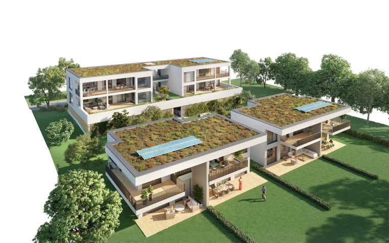 In den 2 dahinter gelagerten kleineren Baukörpern entstehen 4 geräumige Gartenmaisonette Wohnungen (mit Eigenkellern mit rund 60m2) und 4-5 Zimmern, großzügigen und intimen Eigengärten - ideal für sonnige Abendstunden zuhause- beide Baukörper sind süd-west seitig orientiert.