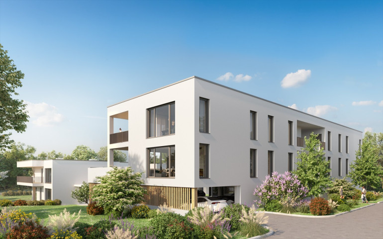 3 Baukörper mit insgesamt 8 Wohneinheiten und einem Parkdeck fügen sich harmonisch in die Umgebung ein.