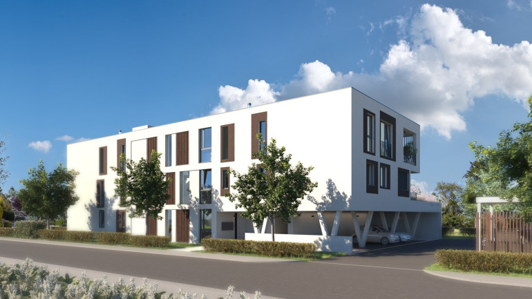 Ein moderner, süd-westseitig orientierter Baukörper fügt sich harmonisch in die Umgebung ein und verfügt über insgesamt 9 Wohneinheiten und ein gebäudeintegriertes Parkdeck.